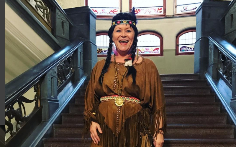 Siv Jensen ble kritisert etter at hun publiserte dette bildet av seg selv utkledd som indianer på en fest i Finansdepartementet i 2017. Foto: Privat