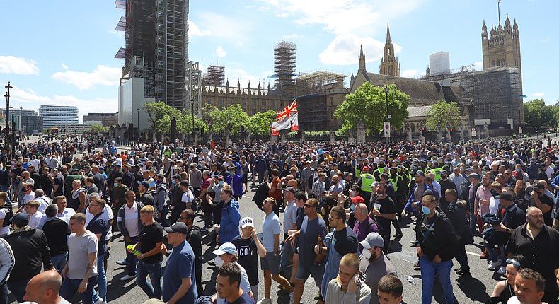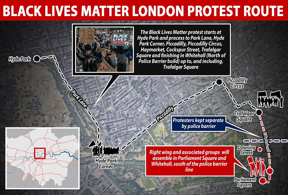 Lørdag formiddag har det samlet seg mange menn i London sentrum. Det ser ut fra bildene til å være mange fotball-supportere og nasjonalistiske grupperinger. De sa at de kom for å beskytte Londons statuer fra Black Lives Matter som sier at de vil rive dem ned. Londons borgermester, Sadiq Khan, setter inn opprørspoliti for å «beskytte» statuene fra de som nettopp betrakter Churchill som en helt.