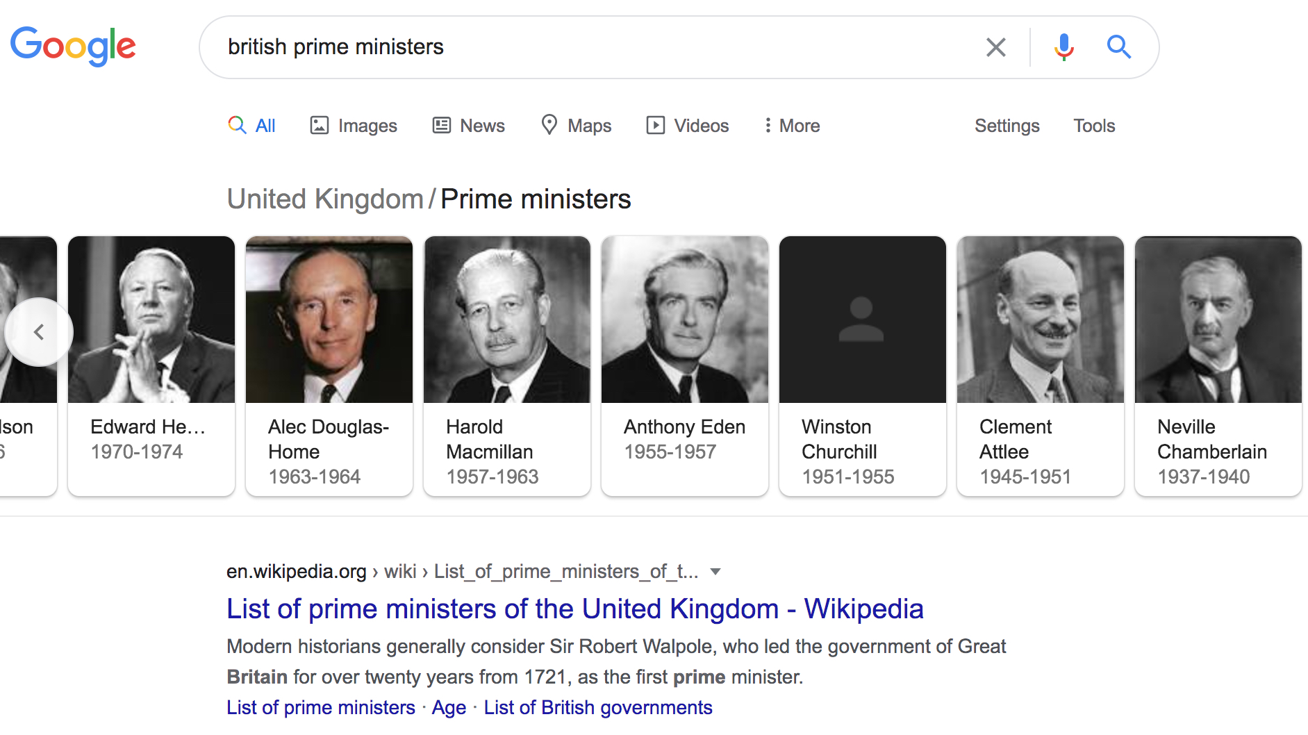 Et Google-søk etter «British prime ministers» returnerer i øyeblikket portrettbilder av samtlige statsministre i nyere tid, unntatt Churchill – og det er utelatt at han var statsminister under andre verdenskrig. Big Tech er i praksis med i klappjakten på konservative ideer og personer. Vestens fiender må le seg skakke.