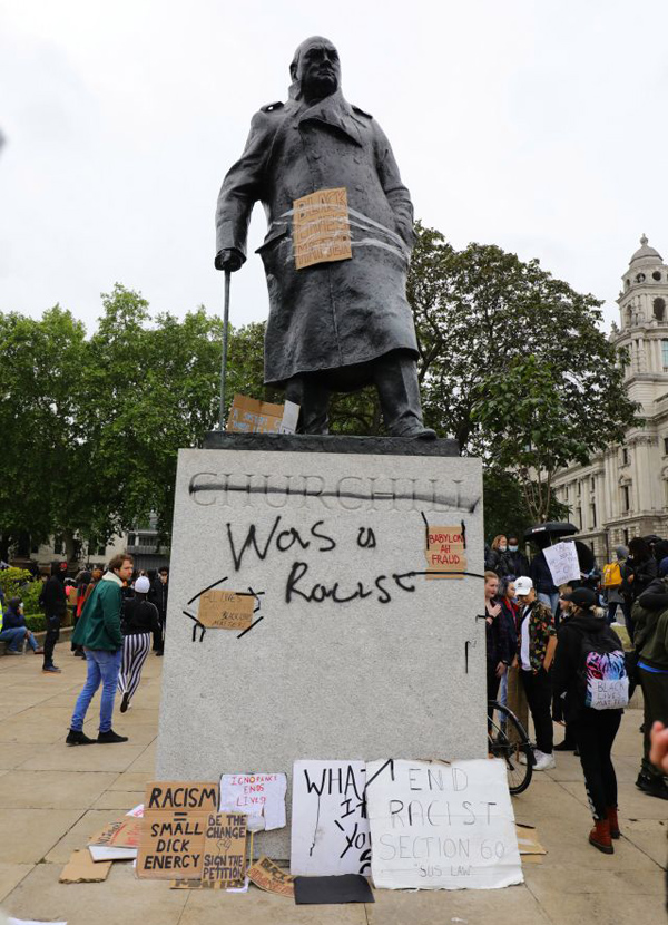 Dette er den spirit som den nye tid er fylt av. Tilsvining av Churchill utenfor Parlamentet.