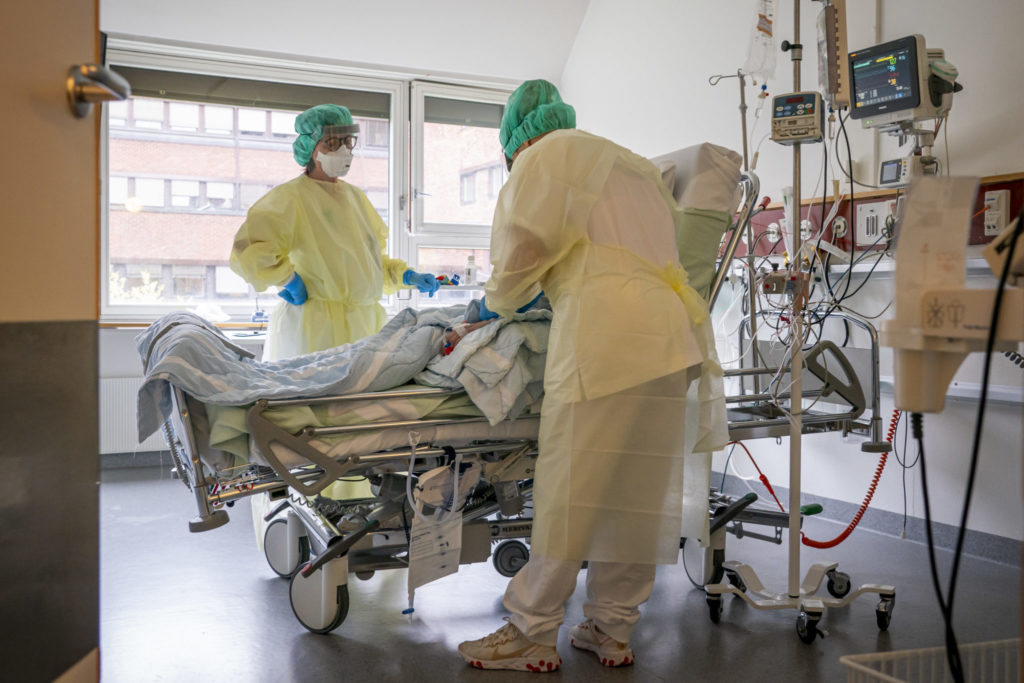 Helsepersonell behandler en eldre kvinne med covid-19-symptomer på intensivavdelingen på Diakonhjemmet i Oslo. Foto: Heiko Junge / NTB scanpix