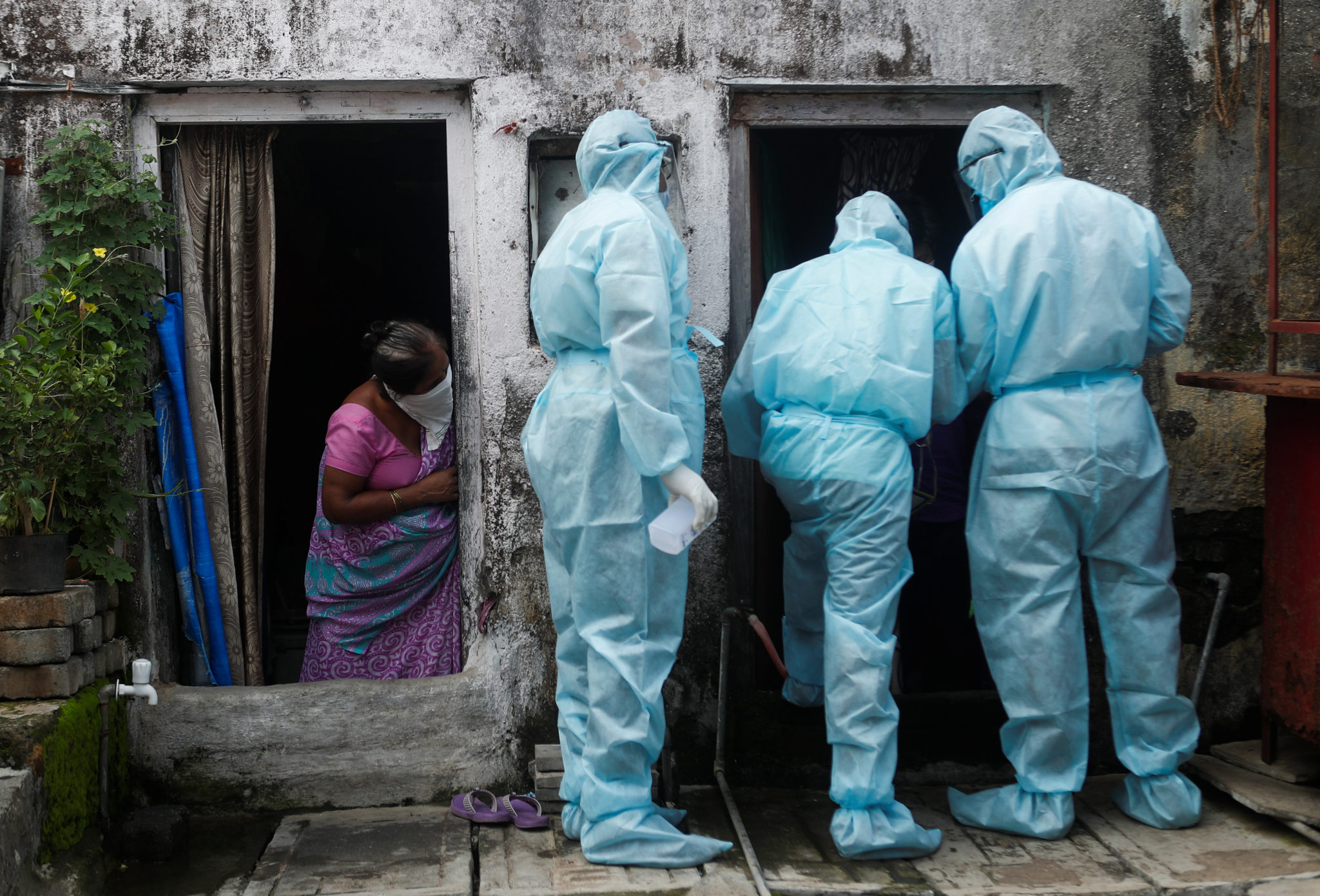 En kvinne følger med mens helsepersonell sjekker temperaturen til beboere i en kontroll-leir for koronasykdom i slummen i Mumbai, India 17. juni 2020. Foto: Reuters / Francis Mascarenhas / NTB Scanpix