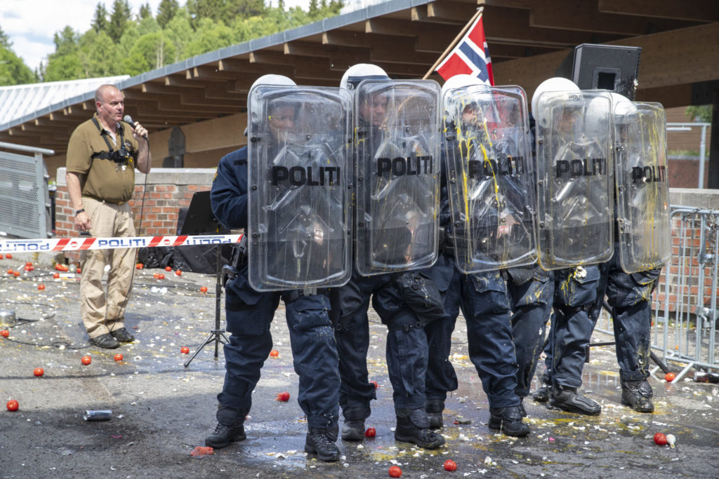 Leder Lars Thorsen i Stopp islamiseringen i Norge (SIAN) søker forgjeves beskyttelse bak en håndfull politi på Mortensrud. Foto: Terje Pedersen / NTB scanpix