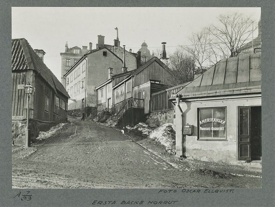 Motivet er hentet fra Ersta backe, nå Erstagatan på Södermalm (vanligvis forkortet til Söder) i Stockholm, muligens en gang rundt forrige århundreskifte. Etablissementet nederst til høyre skilter med Amerikanska pannkaks-grädderiet. Fotografens søster Selma utdannet seg som diakonisse ved Ersta diakoni, like i nærheten.