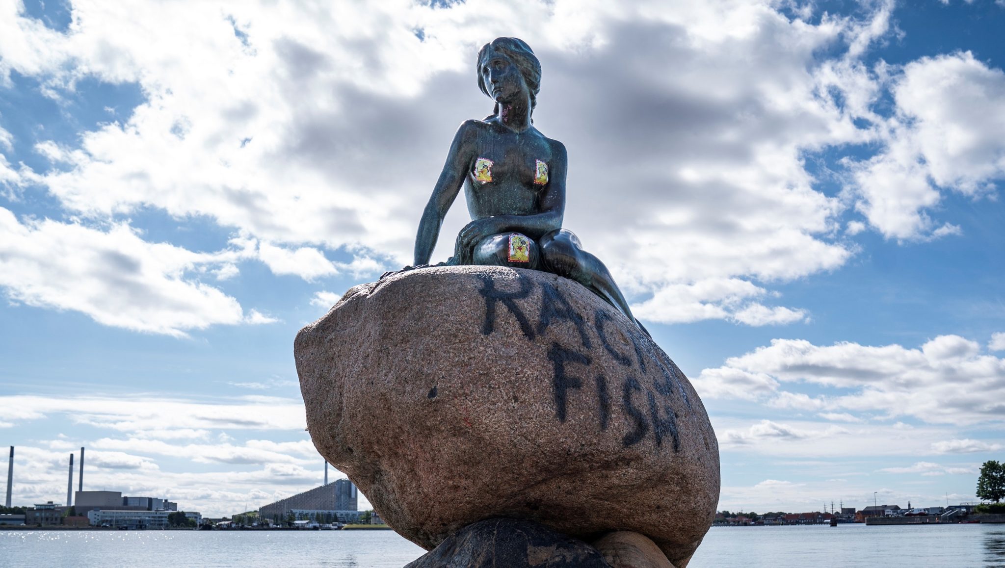 Den lille havfrue er igjen blitt utsatt for hærverk. Denne gangen er hun blitt tagget med «Racist Fish» og fått brystvortene dekket til med klistremerker fra Dansk Ungdoms Fællesråd (DUF).