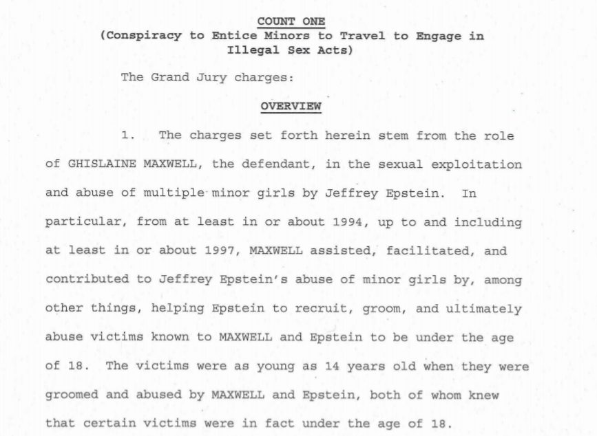 Skjermdump fra siktelsen mot Ghislaine Maxwell.