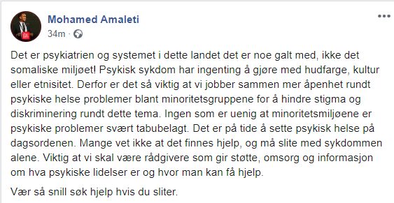 Arbeiderpartipolitiker og bystyrerepresentant i Fredrikstad kommune, Mohamed Amaleti, skriver varme kondolanser til Marianne Haugens datter på Facebook. Men så kommer det et forsvar av det somaliske miljøet og et angrep på systemet i Norge. «Det er psykiatrien og systemet i dette landet det er noe galt med, ikke det somaliske miljøet!»
