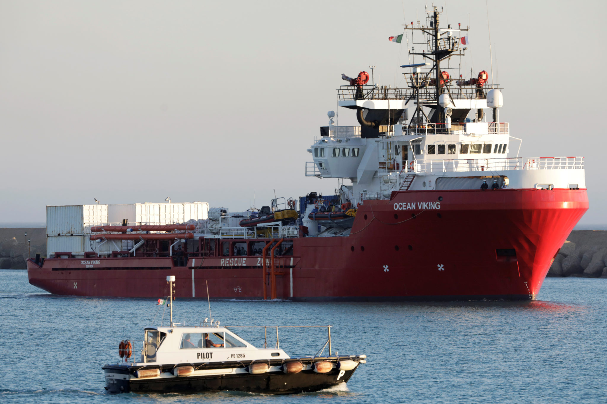 Ocean Viking ankom Porto Empedocle i Italy 6. juli. Skipet holdes fremdeles igjen av italiensk kystvakt. Foto: Reuters / Antonio Parrinello / NTB Scanpix
