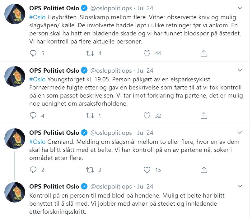 Dette er altså noe av det som politiet har twitret om det siste halvannet døgnet. Vi er sikre på at det har skjedd mange flere voldshendelser de ikke har twitret om. Slik sett tviler vi ikke på at også politiet er blitt mer eller mindre numne av all volden.