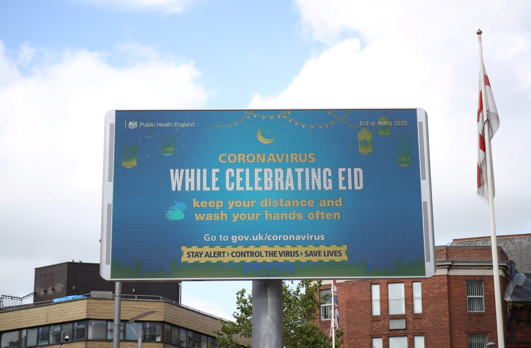 Britiske helsemyndigheter maner til koronaforsiktighet under feiring av eid i Blackburn 1. august 2020. Stengningen av kirkene er glemt. Foto: Molly Darlington / Reuters / Scanpix.