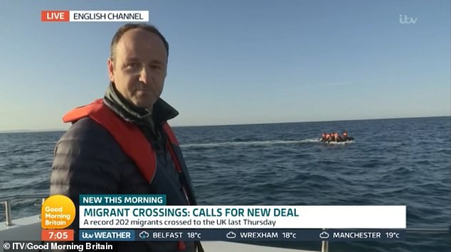 Til seerne, som fulgte det hele på direkten, fortalte Swain: ‘That is actually shadowing a migrant dinghy all the way from the French coast, so no attempt to intercept it or turn it round to France.’