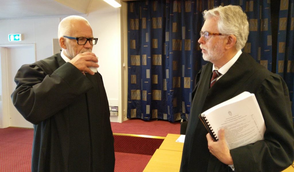 Aktor Lars Rune Ringvik (t.v.) og forsvarer Ove Herman Frang konfererer før retten settes. Foto: Øyvind Thuestad