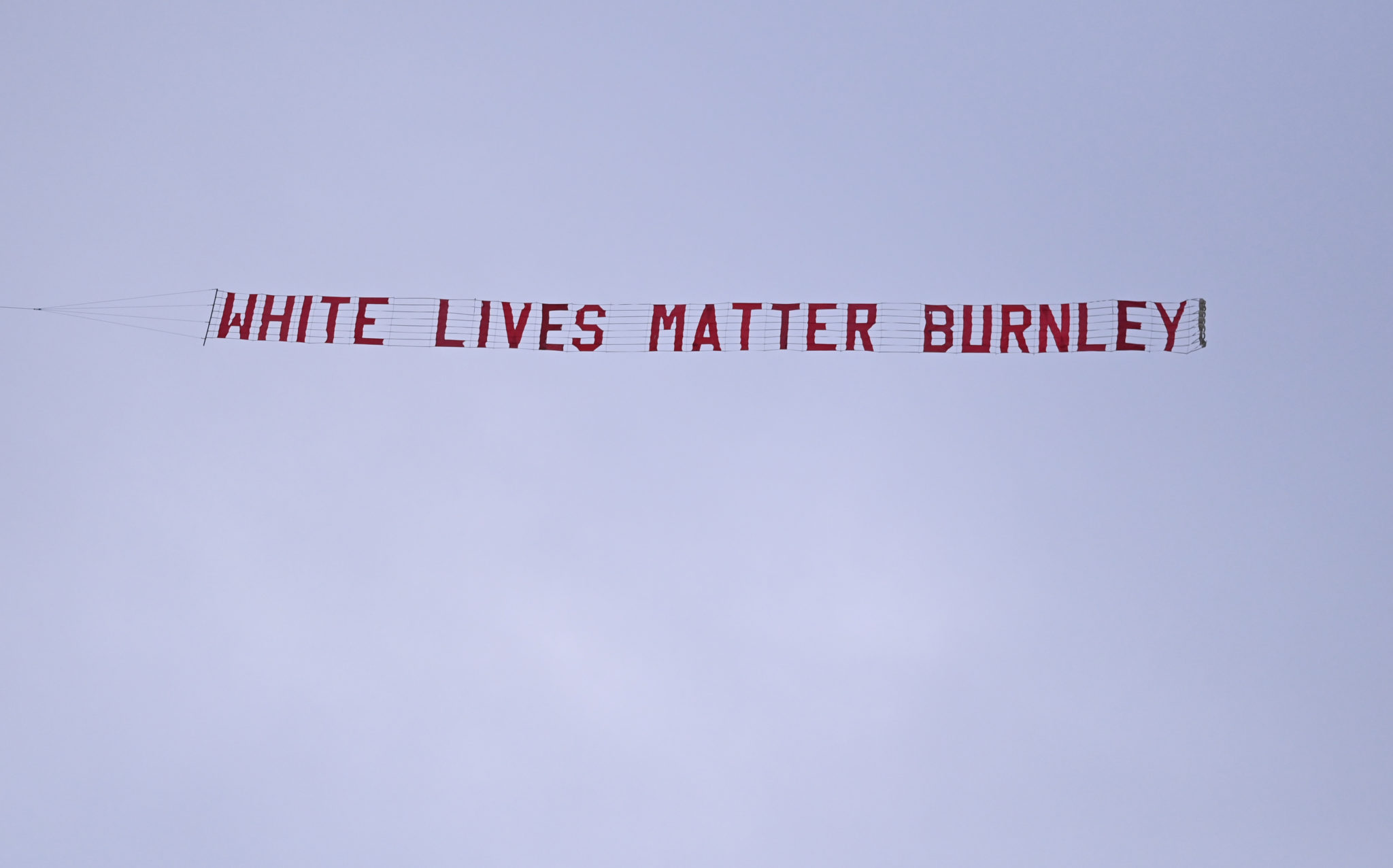 Det er udiskutabelt at hvite liv også teller, men initiativet til å fly dette banneret under en fotballkamp i Burnley, kostet likevel opphavsmannen jobben og livsvarig utestengelse fra stadion. Foto: Shaun Botterill / via Reuters / NTB scanpix.