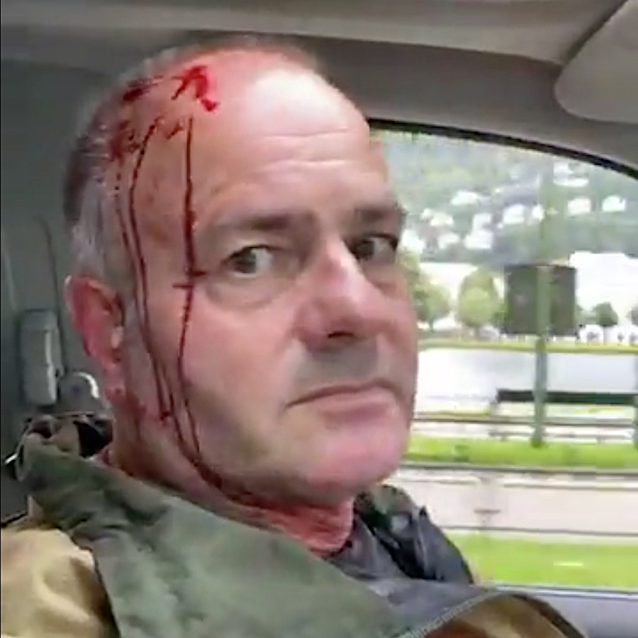 SIAN-leder Lars Thorsen på vei bort fra Festplassen i Bergen den 22. august 2020, etter at organisasjonens markering ble avbrutt med vold. Stillbilde fra video: Facebook.