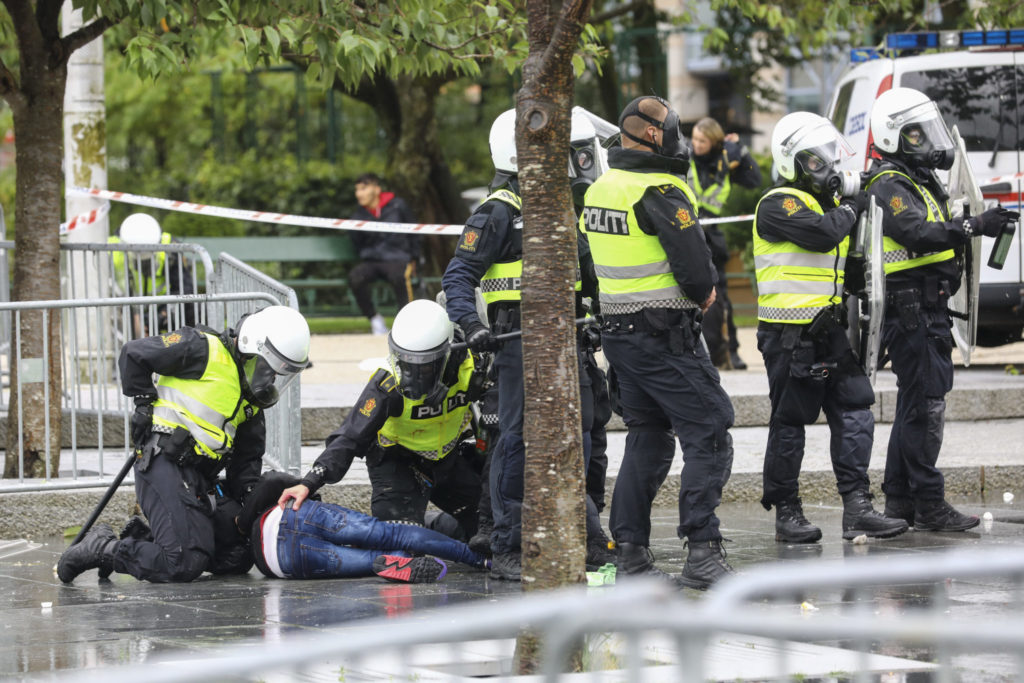 Politiet tar hånd om en person etter at det oppsto uroligheter under en Sian-markeringen på Festplassen i Bergen lørdag. Foto: Eivind Senneset / NTB Scanpix