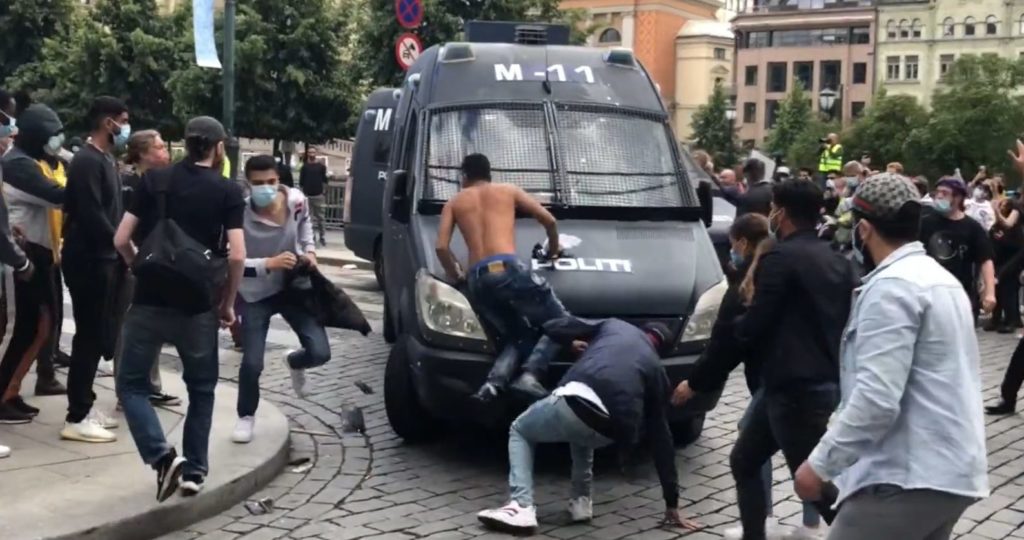 Rasende pøbel slo, sparket og kastet stoler og sparkesykler på politiets biler etter at Sian-markeringen foran Stortinget var over. Flere ropte «Allahu Akbar!»