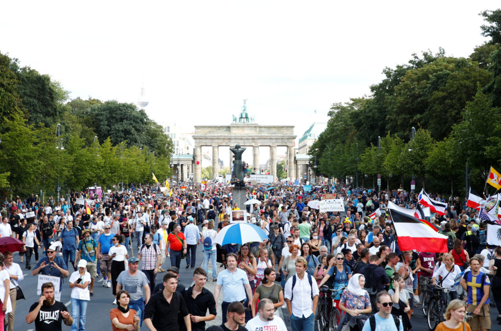 Nesten 18.000 mennesker samlet seg ifølge politiet i sentrum av Berlin lørdag for å protestere mot regjeringens tiltak for å hindre koronasmitte.