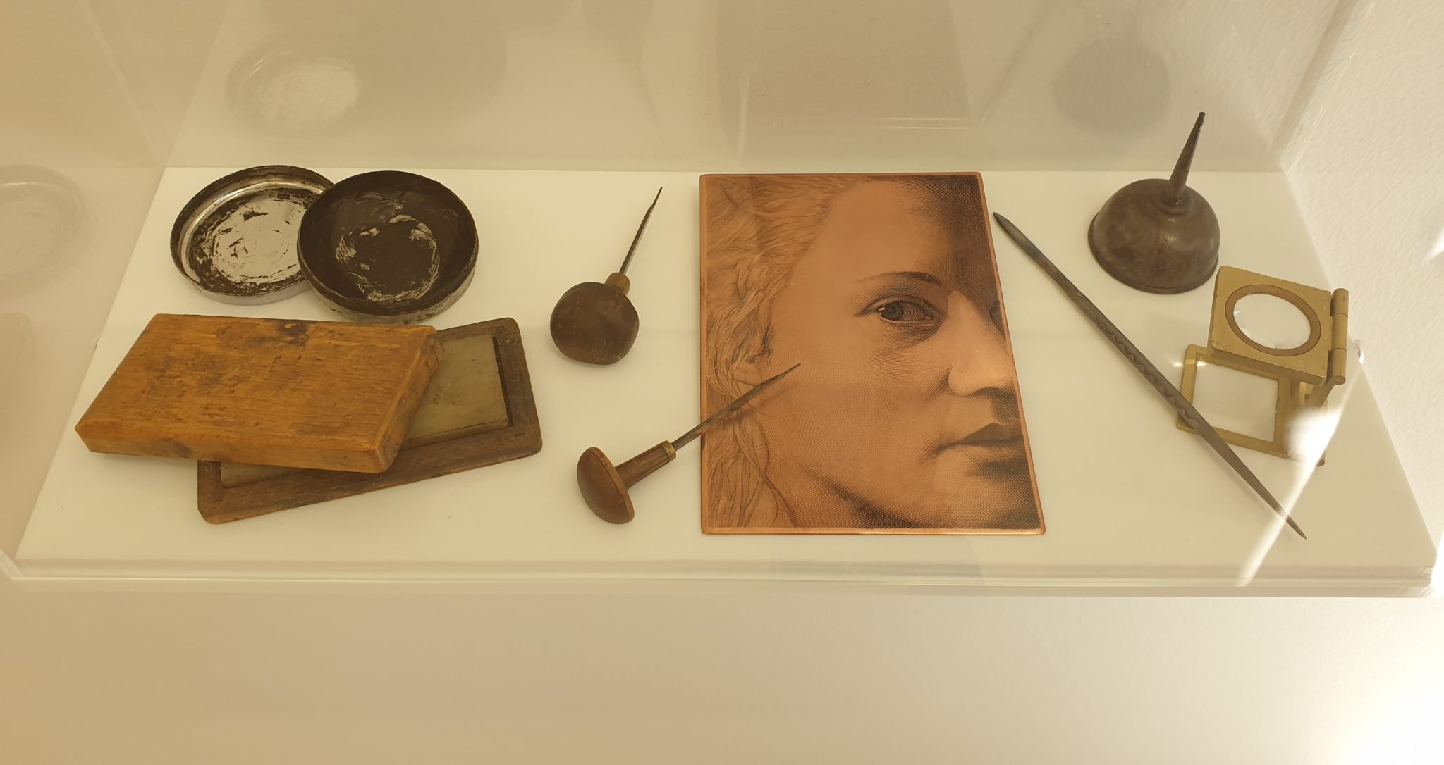 I en glassmonter viser kunstneren også en kobberplate og de redskaper som han benytter i graveringen. Fra min tid på Kunstakademiet husker jeg godt dette utstyret og hvor vrient det var å styre stikkelen når linjer skulle graveres inn i kobberplaten. Jeg skjønte raskt at dette ikke var noe for meg, litografiet derimot fikk jeg bedre tak på. Nå ligger det sikkert mye øvelse og arbeid bak Arild Yttris perfeksjonisme med stikkelen. Han må også ha særlige anlegg for denne teknikken, som i hans hender gir håndverket en fornyet og opphøyd status.