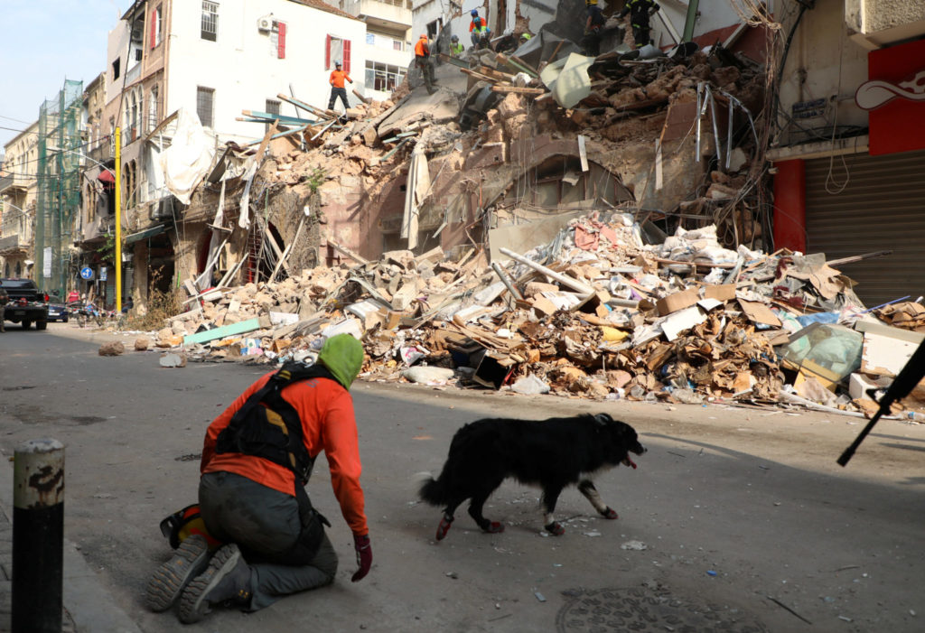 En tjenestehund sendes inn i ruinene etter den massive eksplosjonen i Beiruts havneområde. Tirsdag ankommer Italias statsminister Beirut for å vise solidaritet. Foto: REUTERS / Mohamed Azakir / NTB Scanpix