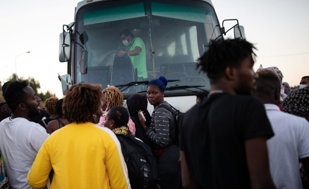 Migranter fra Moria-leiren på vei ombord i en buss torsdag. Foto: Alkis Konstantinidis / Reuters / NTB scanpix