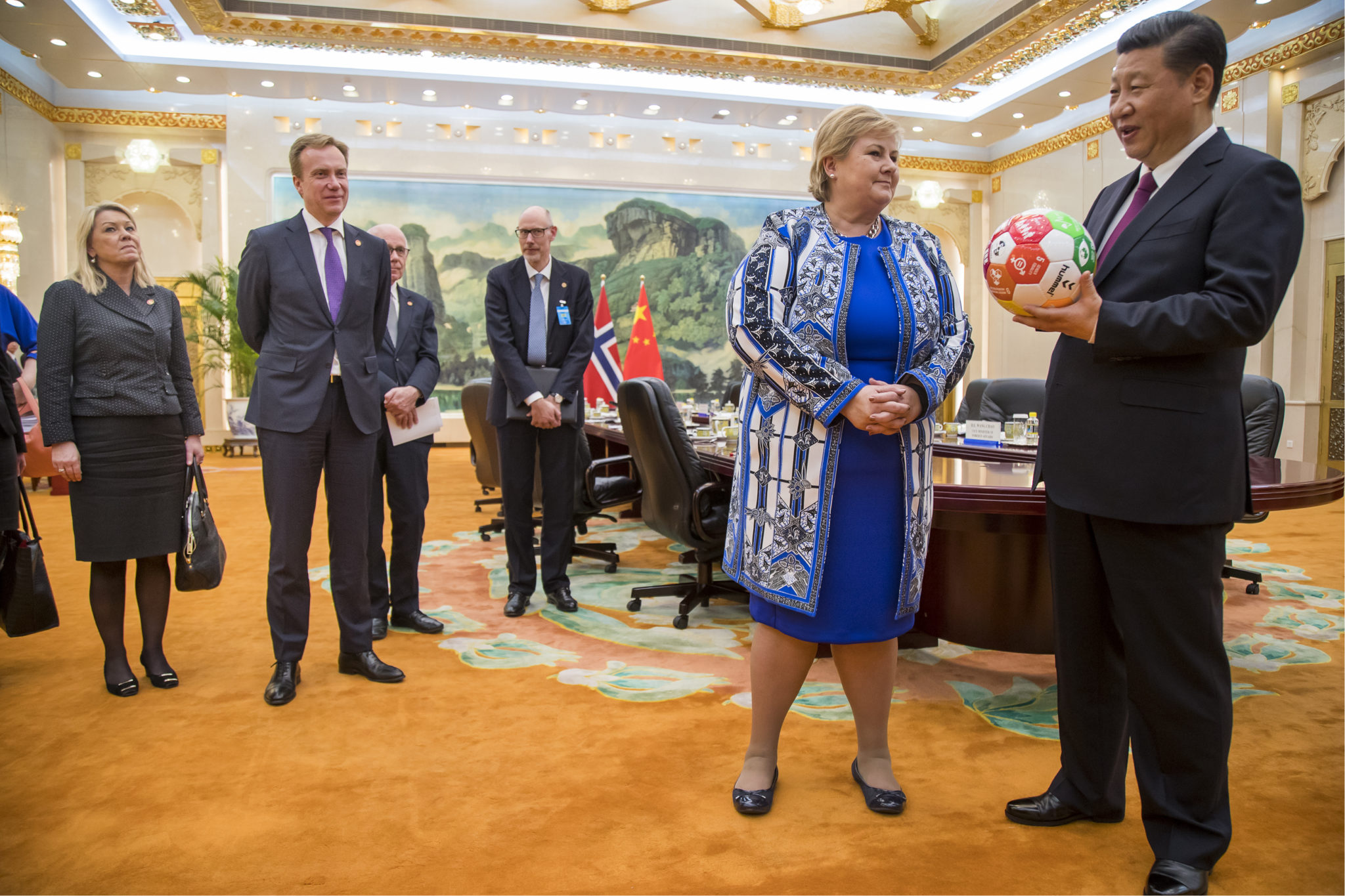 Statsminister Erna Solberg, utenriksminister Børge Brende og næringsminister Monica Mæland møter Kinas president Xi Jinping i Folkets store hall i Beijing den 10. april 2017. Solberg har med seg en fotball med FNs 17 bærekraftsmål i gave til presidenten. Foto: Heiko Junge / NTB scanpix.
