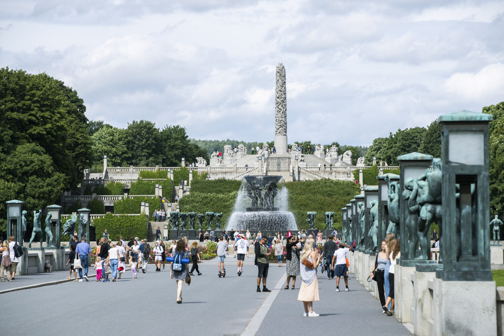 Turister kikker på skulpturene i Frognerparken i Oslo. Sommeren gikk bedre enn ventet for den norske reiselivsnæringen, men frykten er at høsten blir tung. Mandag kommer det mer krisehjelp. Foto: Berit Roald / NTB