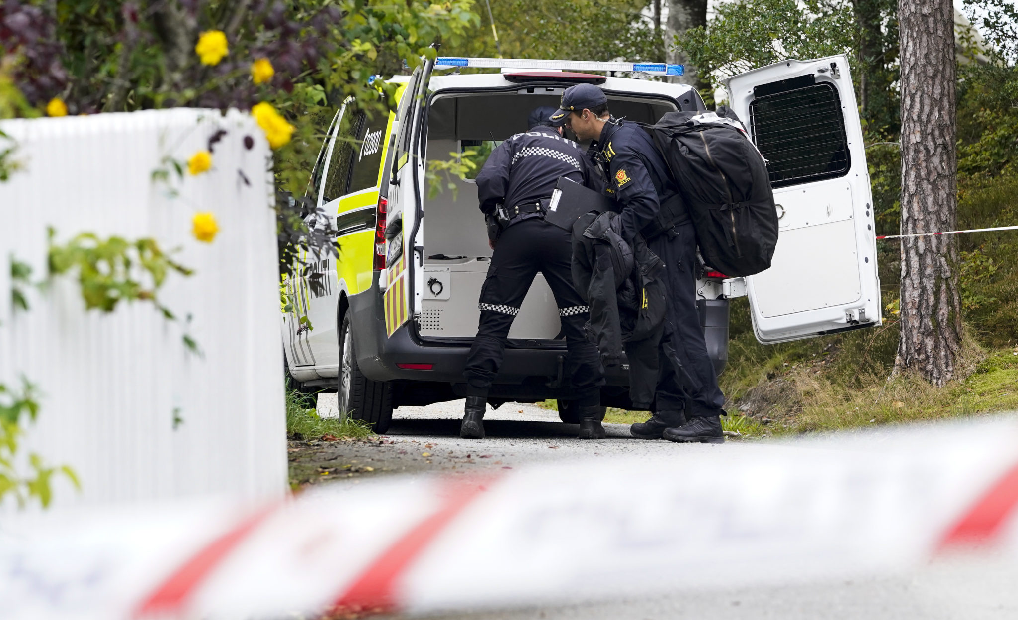 Politiets bombegruppe bærer inn utstyr til området. Foto: Jan Kåre Ness / NTB