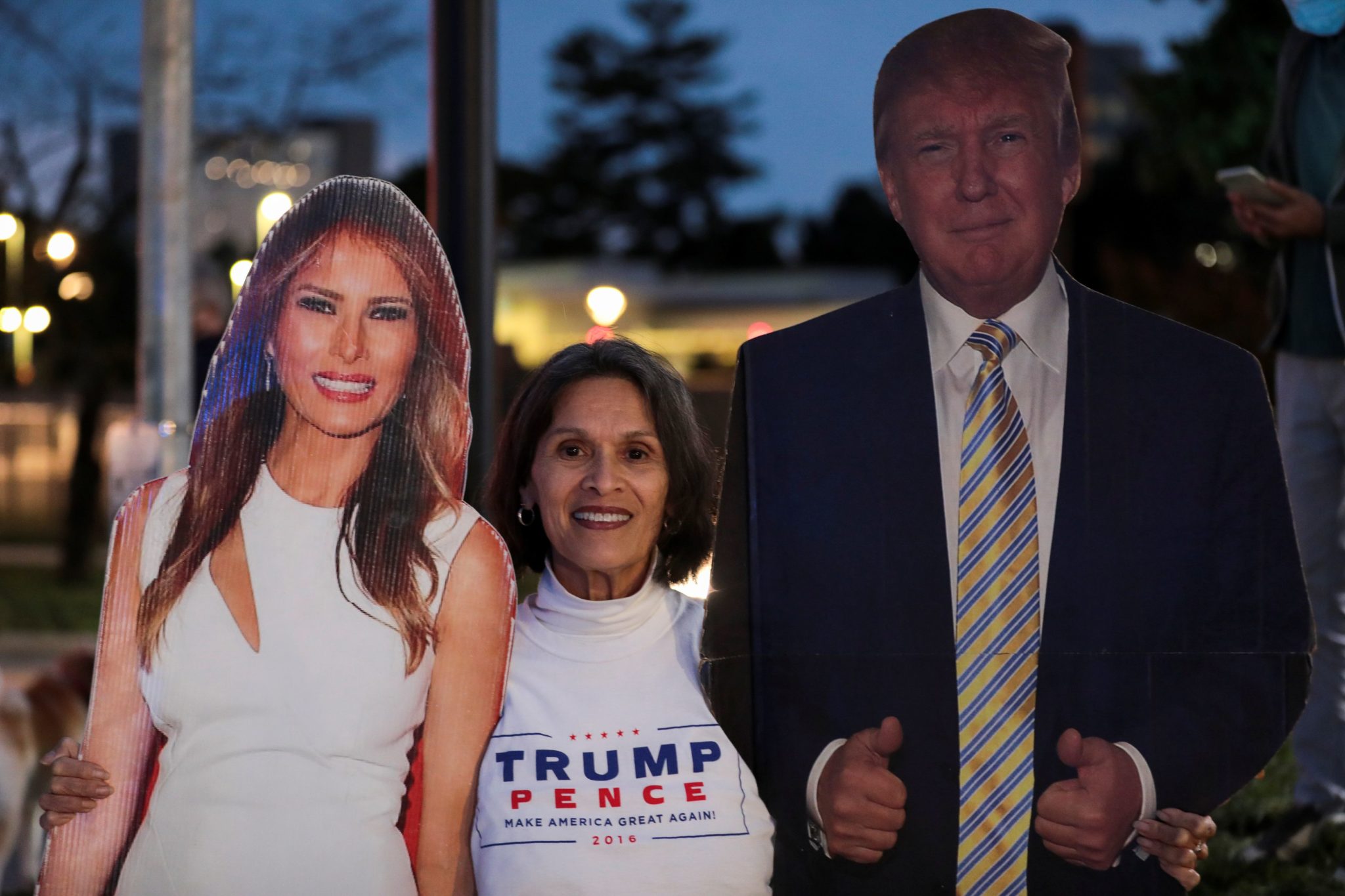 En supporter med figurer av Melania og Donald Trump utenfor Walter Reed-sykehuset søndag 4. oktober. Foto: Cheriss May/Reuters/Scanpix