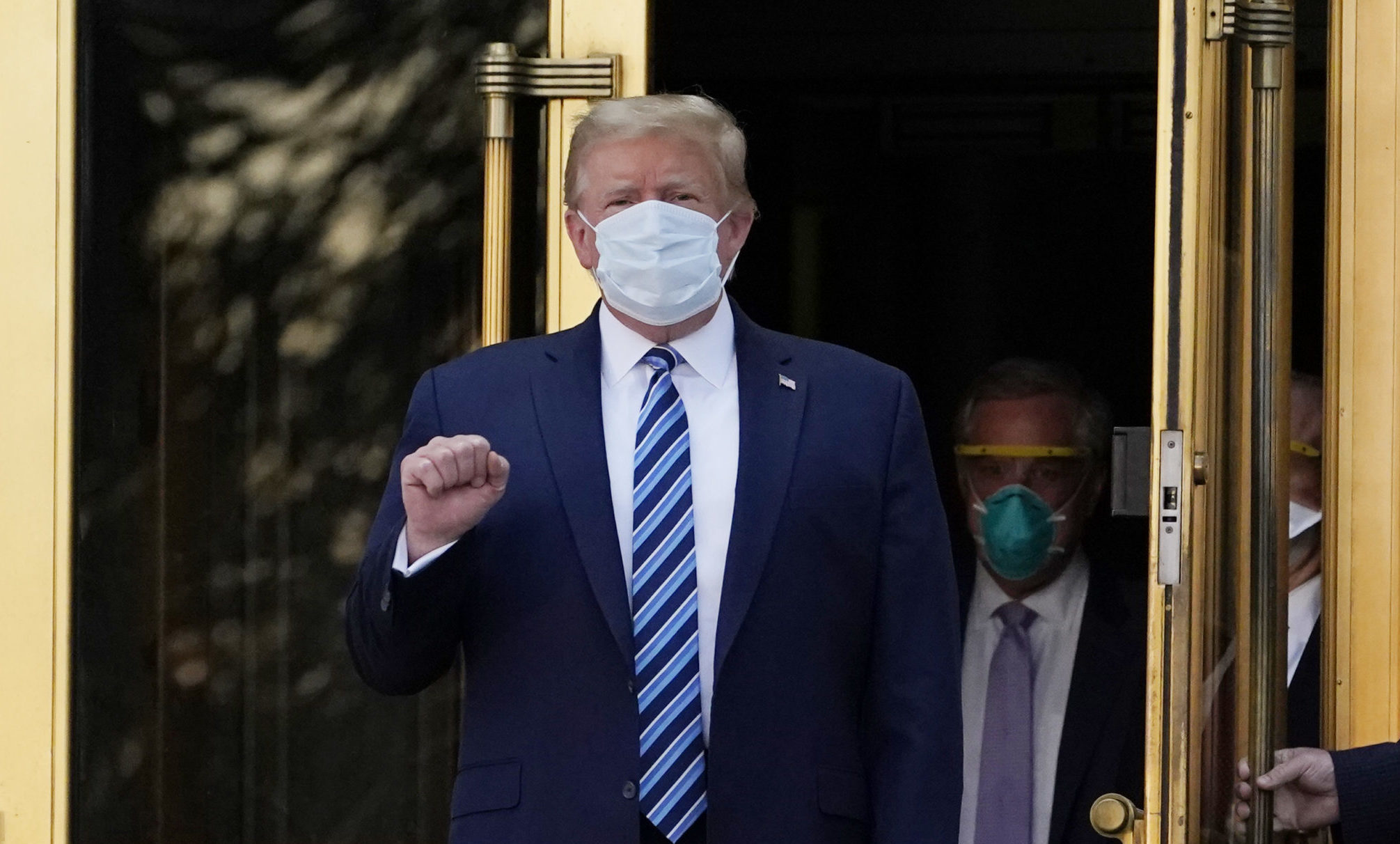 President Donald Trump spaserte mandag kveld ut av sykehuset der han har vært innlagt i tre dager for covid-19. Behandlingen fortsetter i Det hvite hus.