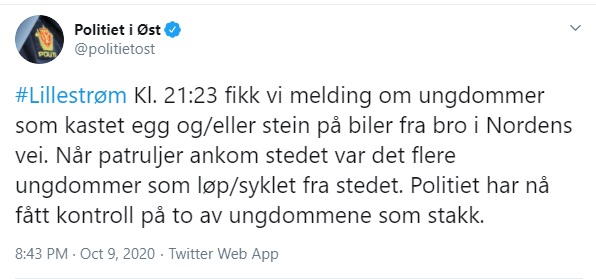 Ungdom kastet egg og/eller stein på biler fra gangbro i Nordens vei på Skjetten, skriver politiet på Twitter. Politiet greide å få tak i to av ungdommene.