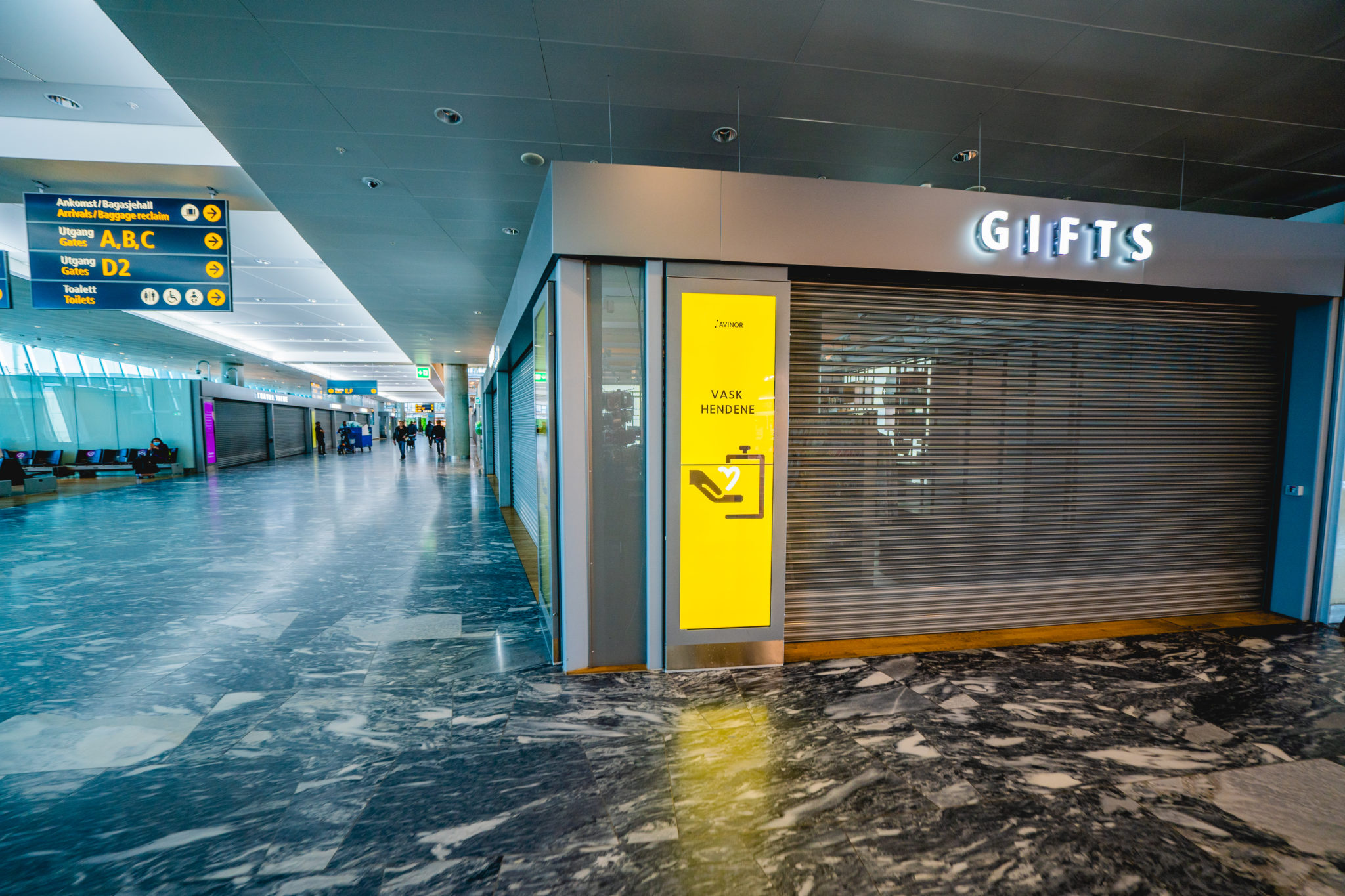Koronapandemien har gått hardt utover luftfarten. Her er stengte butikker og oppfordring til å vaske hendene i avgangshallen på Oslo lufthavn. Foto: Stian Lysberg Solum / NTB