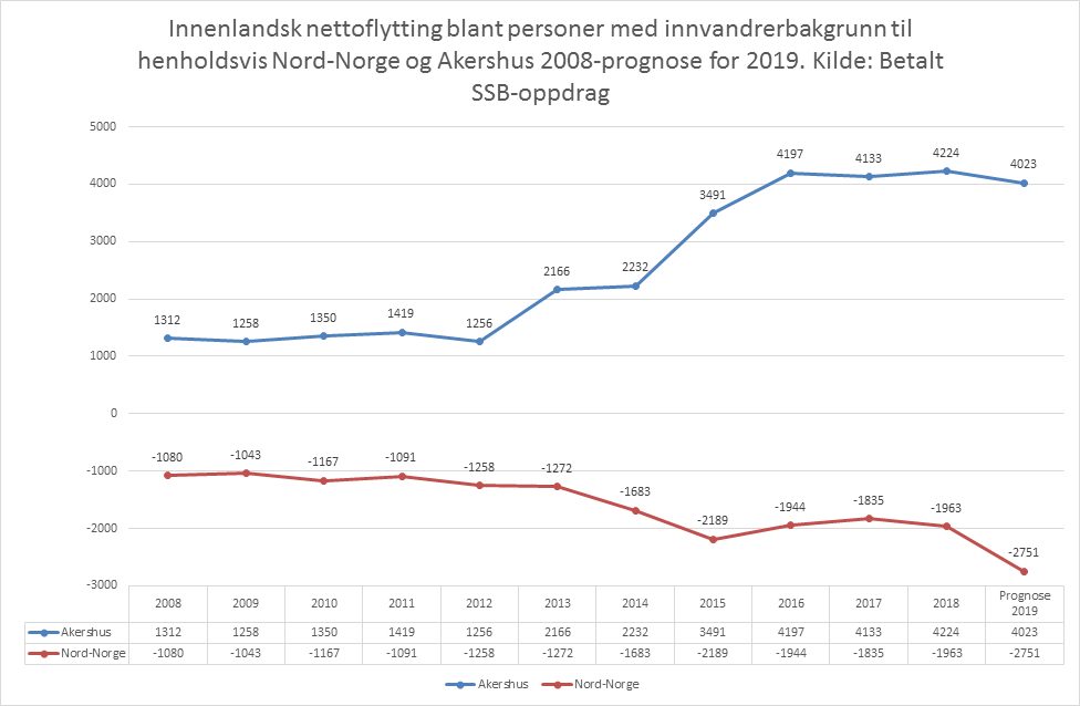 Akershus har hatt nettoinnflytting av innvandrere fra andre fylker på over 4000 hvert år siden 2016. Og dette er altså kun den innenlandske flyttestrømmen. Bosetting av flyktninger kommer i tillegg.