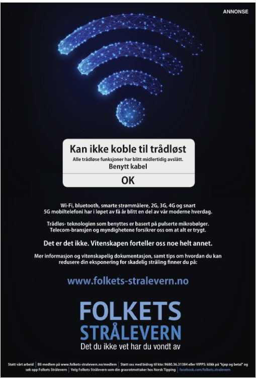 Flere sentrale saker for landet vårt blir verken nevnt eller debattert på en ryddig måte i det som engang var våre trauste, pålitelige og nøytrale medier. 5G-saken en av dem – nyheter om forskningsfunn på mikrobølget stråling har lenge feilet i å nå hele den vestlige befolkning. Tunge kvalitetsstudier har funnet bevis for at trådløse nettverk er mer skadelig for oss enn vi aner. Sjelden har de nådd veien fra fagfellevurderte vitenskapelige tidsskrifter, til nyhetsbildet. En artikkel fra 2018 i Teknisk Ukeblad eksemplifiserer godt hvordan de bevisene som i det hele tatt blir omtalt, fargelegges:
