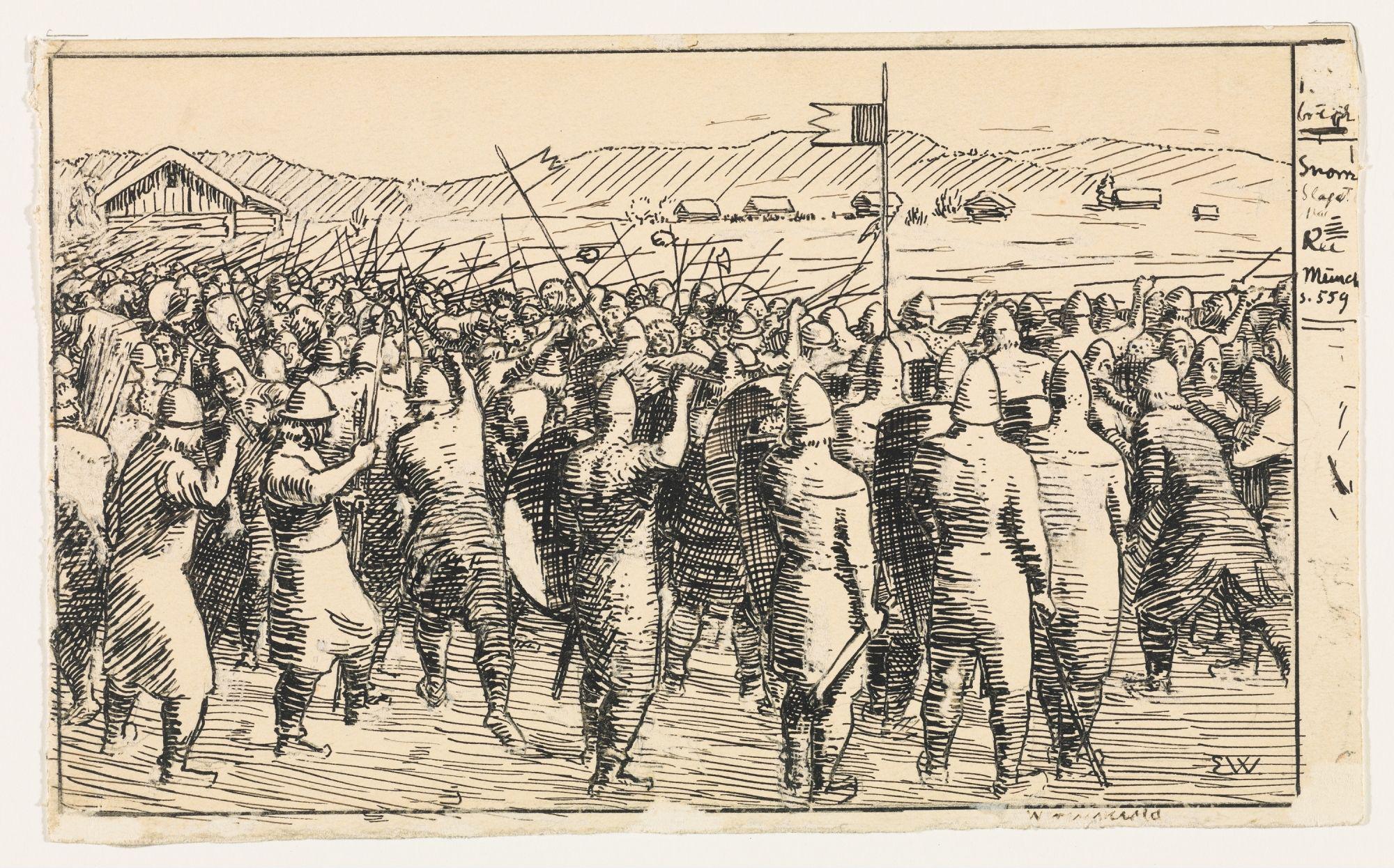 Erik Werenskiold er kjent som både maler og illustratør, spesielt for Asbjørnsen og Moes folkeeventyr, og for Snorres kongesoger. Motivet her er Slaget på Re, som fant sted i januar 1177, der kong Magnus Erlingsson (1156-1184) slo birkebeinerne godt og grundig.