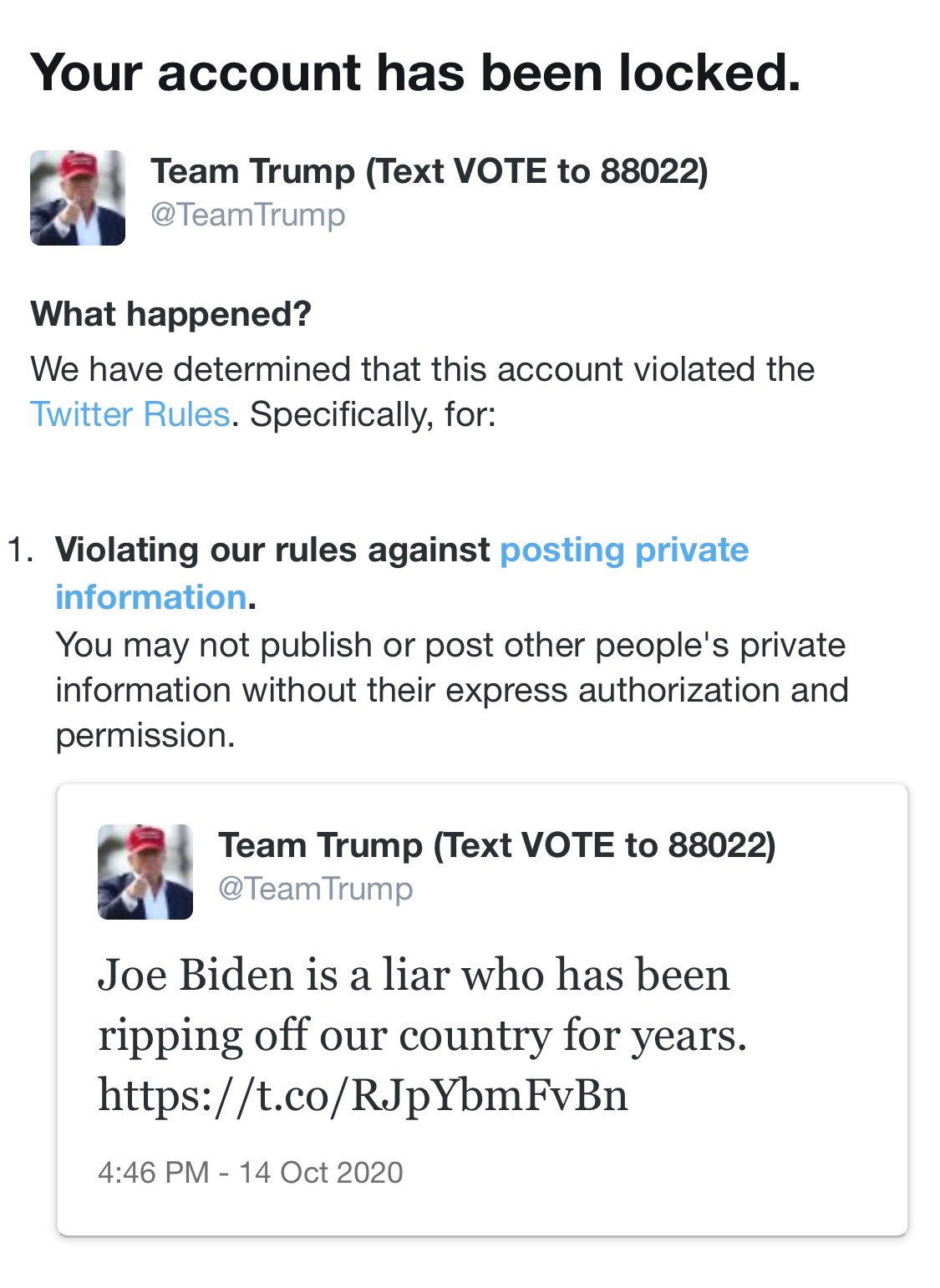 Selskapet begrunner det hele med at Trump-leiren postet privat informasjon uten å ha spurt om tillatelse. Twitter ser imidlertid ikke ut til å ha suspendert kontoer som har omtalt Trumps skatteforhold.
