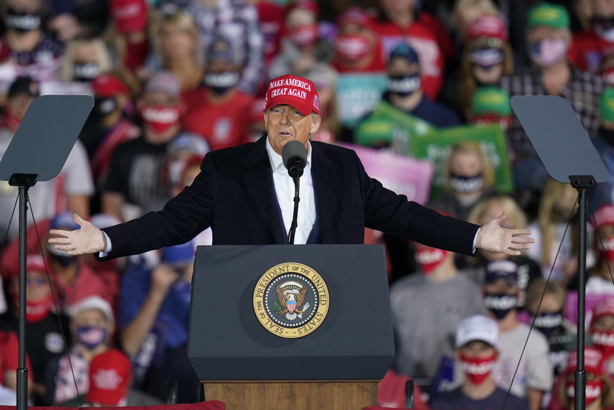 Donald Trump taler under et valgmøte ved flyplassen i Des Moines, Iowa, den 14. oktober 2020. Foto: Charlie Neibergall / AP / NTB.