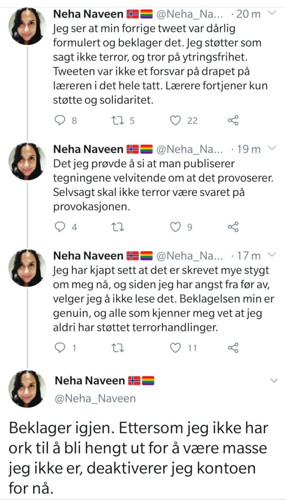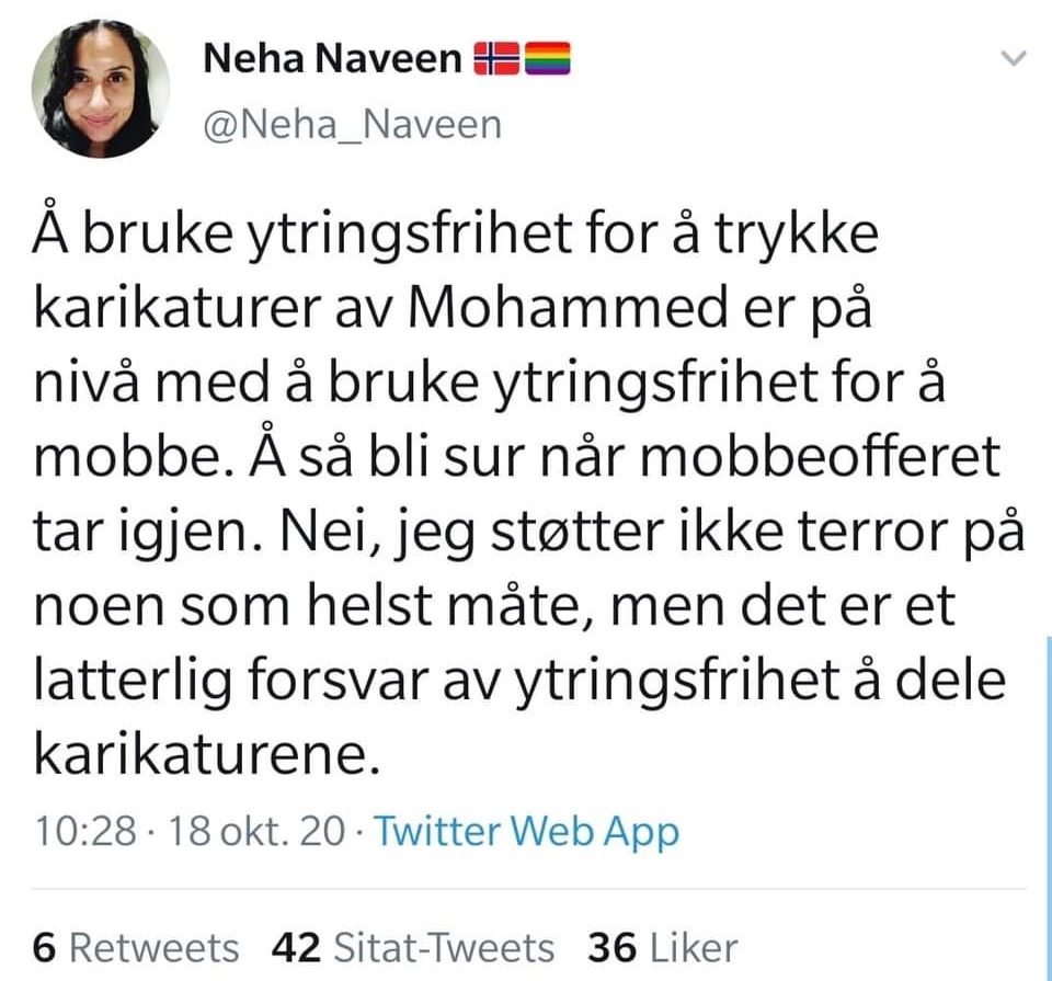 Den som måtte tro at det bare er land som Frankrike og Sverige som står til knes i problemer, bør sjekke hva våre egne innfødte, høyt utdannede innvandrere står for. Neha Naveen (33) har mastergrad i kulturstudier, er forfatter og SV-politiker. Naveen sier at det er drapsmannen, Abdullakh Anzorov, som er offeret – ikke Samuel Paty.