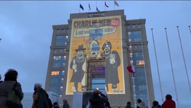 Karikaturer i gigantformat på offentlige bygninger i Frankrike skal illustrere viljen til å kjempe for ytringsfriheten. Skjermdump L’independant.