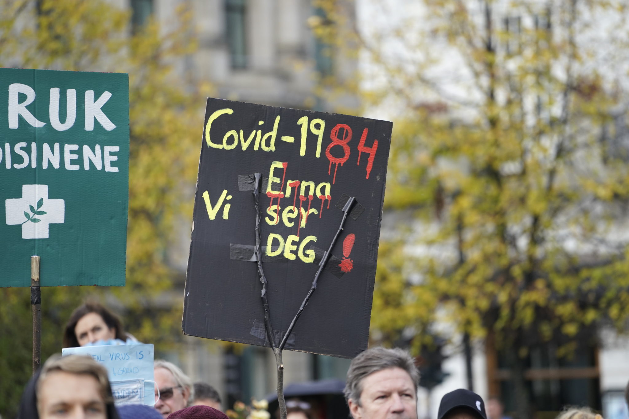 Drøyt 150 personer tok turen til Eidsvolls plass utenfor Stortinget søndag for å demonstrere mot regjeringens håndtering av koronapandemien.