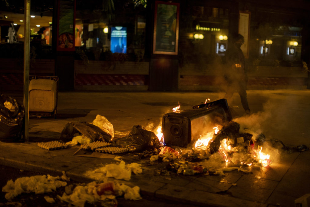 Påtente søppelcontainere var en del av gatebildet under opptøyene i Madrid søndag. Foto: AP Photo/Manu Fernandez