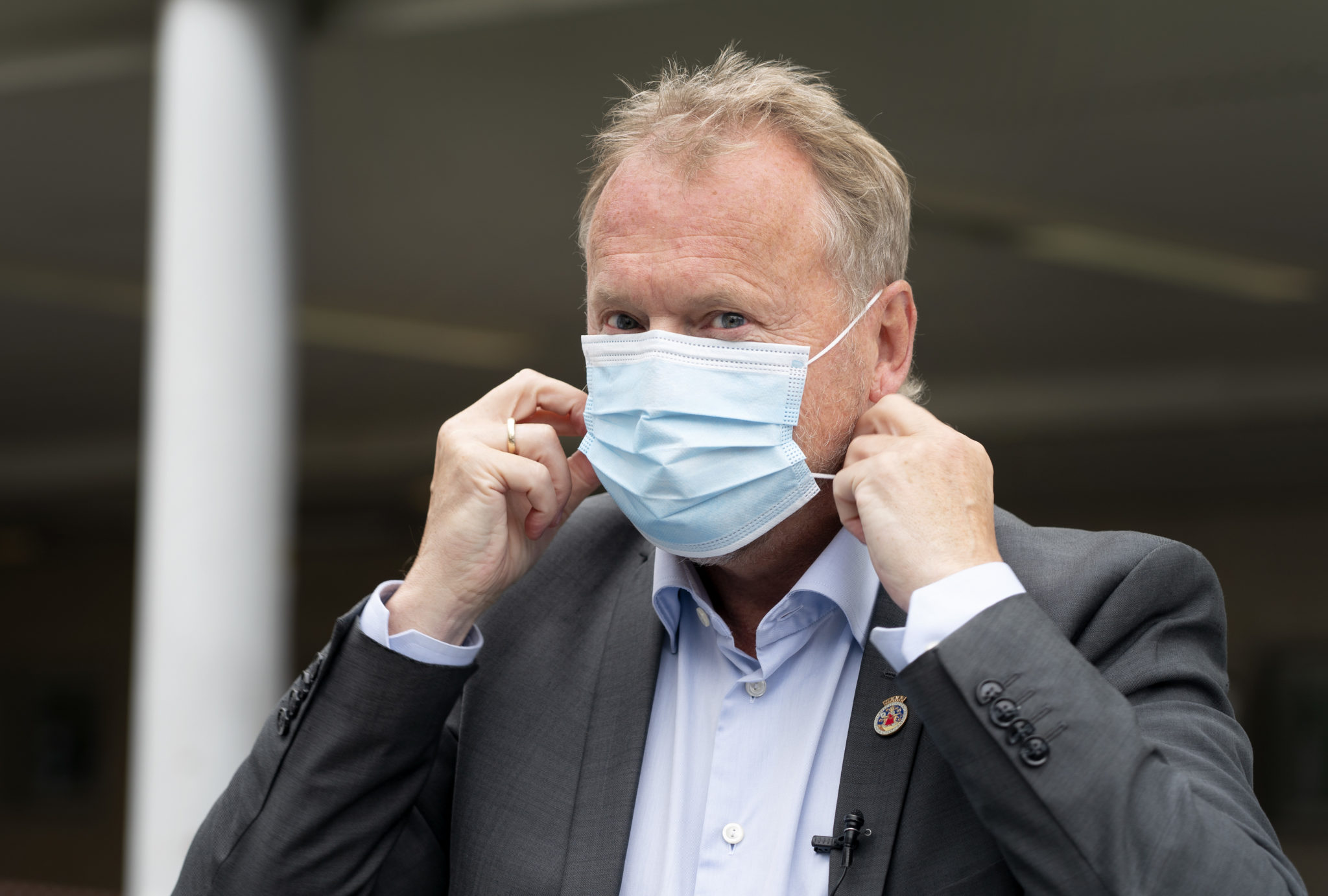 Byrådsleder Raymond Johansen tar på seg munnbind under et besøk på koronateststasjonen utenfor Aker legevakt. Foto: Gorm Kallestad / NTB