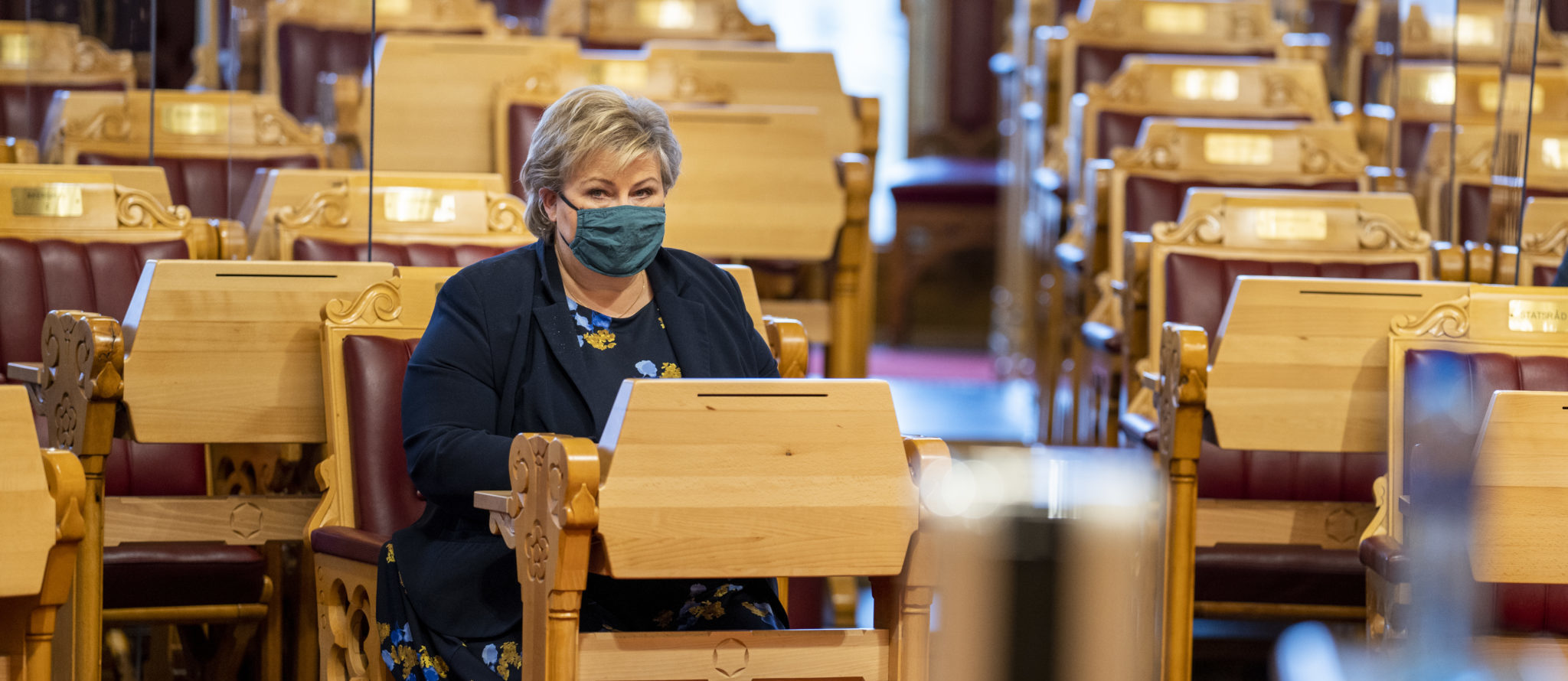 Statsminister Erna Solberg (H) under den muntlige spørretimen på Stortinget onsdag. Foto: Heiko Junge / NTB
