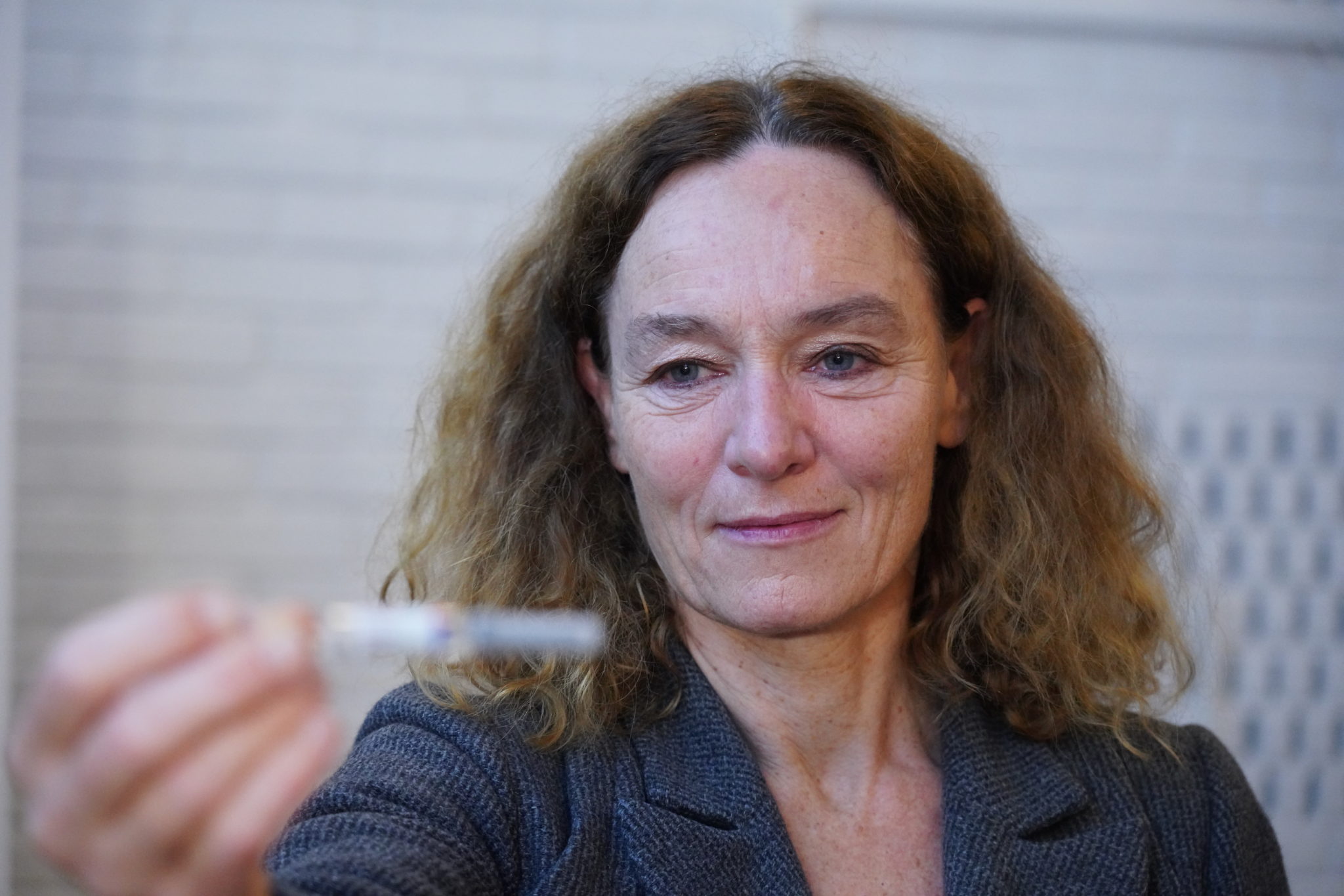 Direktør for Folkehelseinstituttet Camilla Stoltenberg holder fram en influensavaksine. Hun sier at det har vært svært få influensatilfeller så langt i år. Foto: Ole Berg-Rusten / NTB