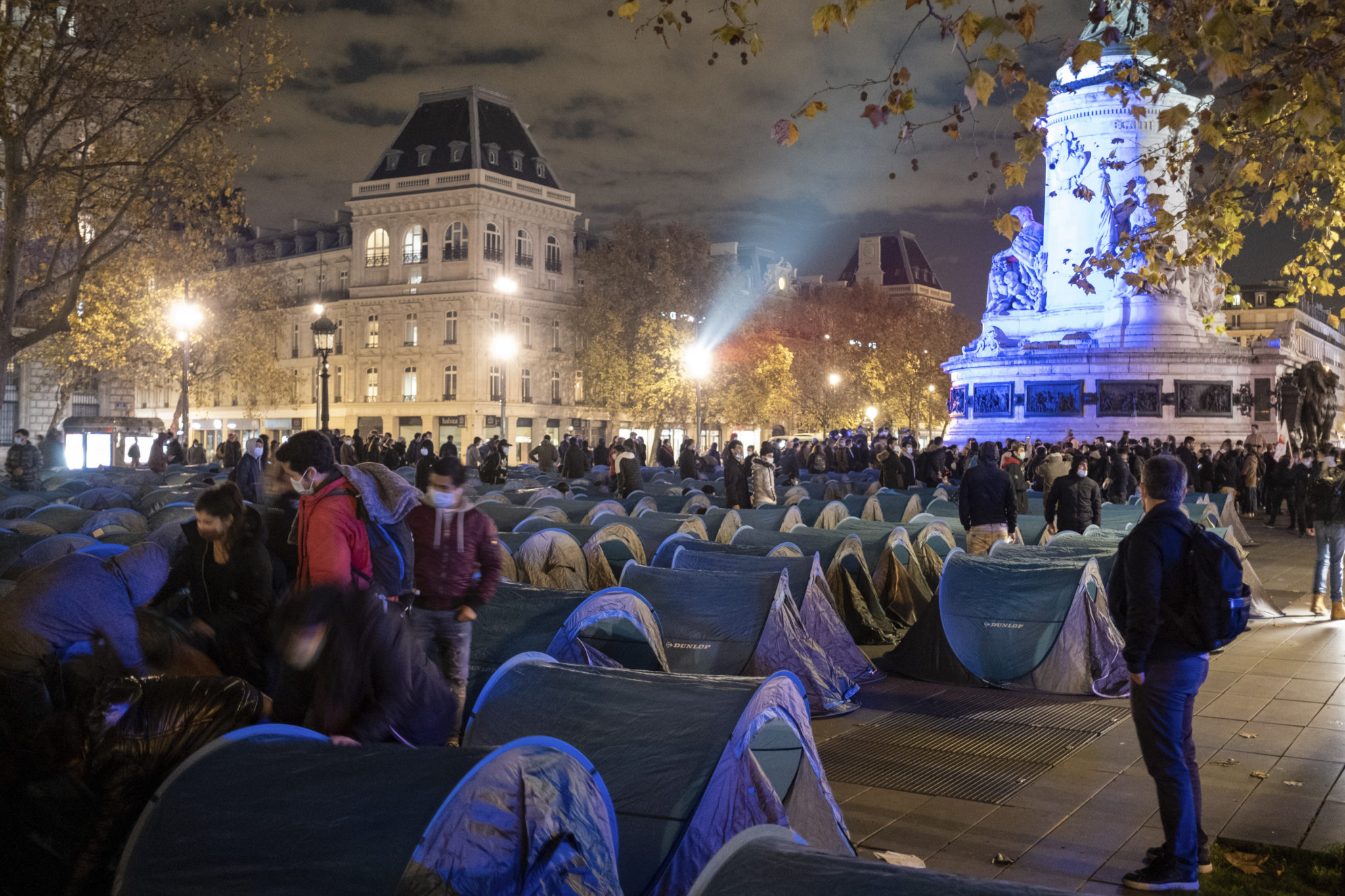 Migranter har satt opp en teltleir på Place de la Republique i sentrum av Paris den 23. november 2020. Foto: Alexandra Henry / Utopia56 via AP / NTB.