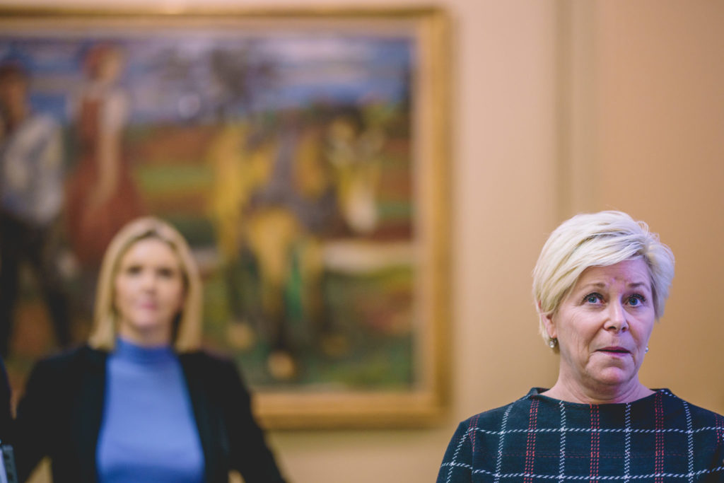 Siv Jensen under presentasjonen av budsjettforliket i Stortinget 1. desember. Sylvi Listhaug i bakgrunnen. Foto: Stian Lysberg Solum/Scanpix