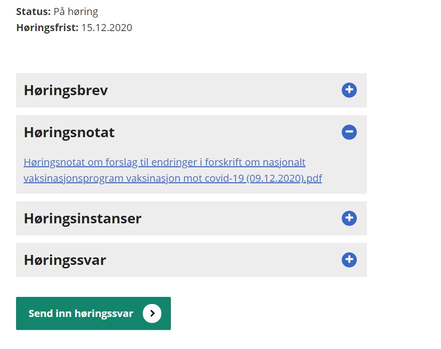 Som privatperson kan du altså innen i morgen gi et høringssvar om fastlegens plikt til vaksinering. Det er et grønt felt merket «Send inn høringssvar» som du klikker deg inn på.
