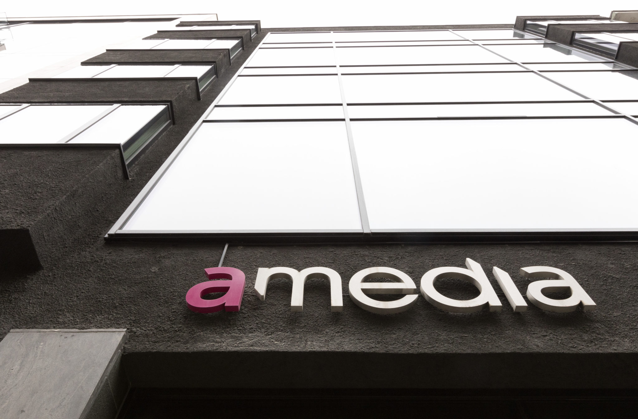 Amedia logo og bygg. Foto: Gorm Kallestad / NTB