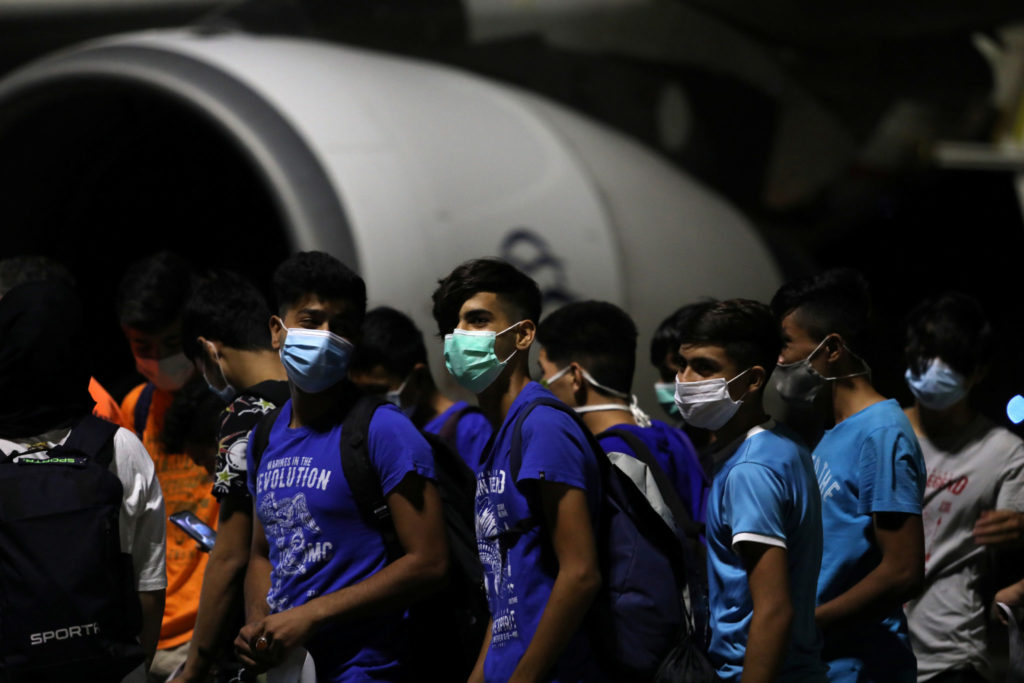 Migranter på vei om bord i et fly etter brannen i Moria-leiren i september. Foto: Elias Marcou / Reuters / NTB