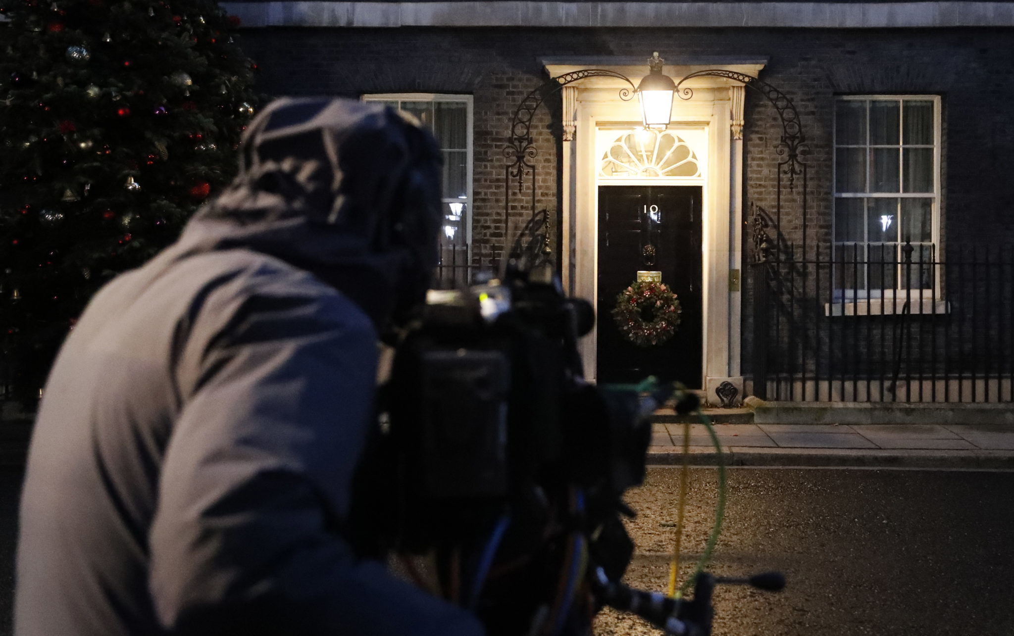 Torsdag morgen ventet journalister utenfor den britiske statsministerboligen, der det var ventet at en avtale med EU ville bli kunngjort. Foto: Frank Augstein / AP / NTB