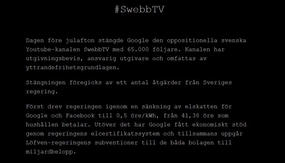 En rekke frie svenske medier stengte tirsdag ned sine sider i sympati med den populære svenske web-kanalen SwebbTV, som ble stengt ned av Google lille julaften. Oppropet retter seg både mot Google og den svenske regjeringen.